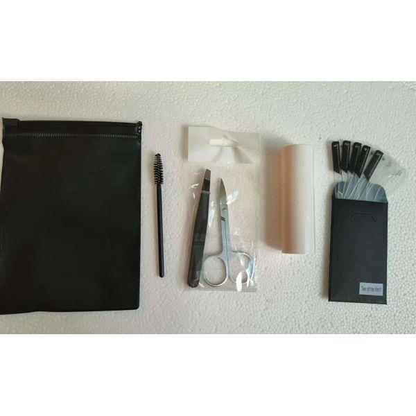 Each eyebrow kit includes: 1 Stamp (Medium Brown; Blonde; Taupe; Soft Brown; Nearly Black), 5 eyebrow stencils with black paper bag, 1 or 2 tweezers, 1 brow brush, and a small makeup bag perfect for travel.